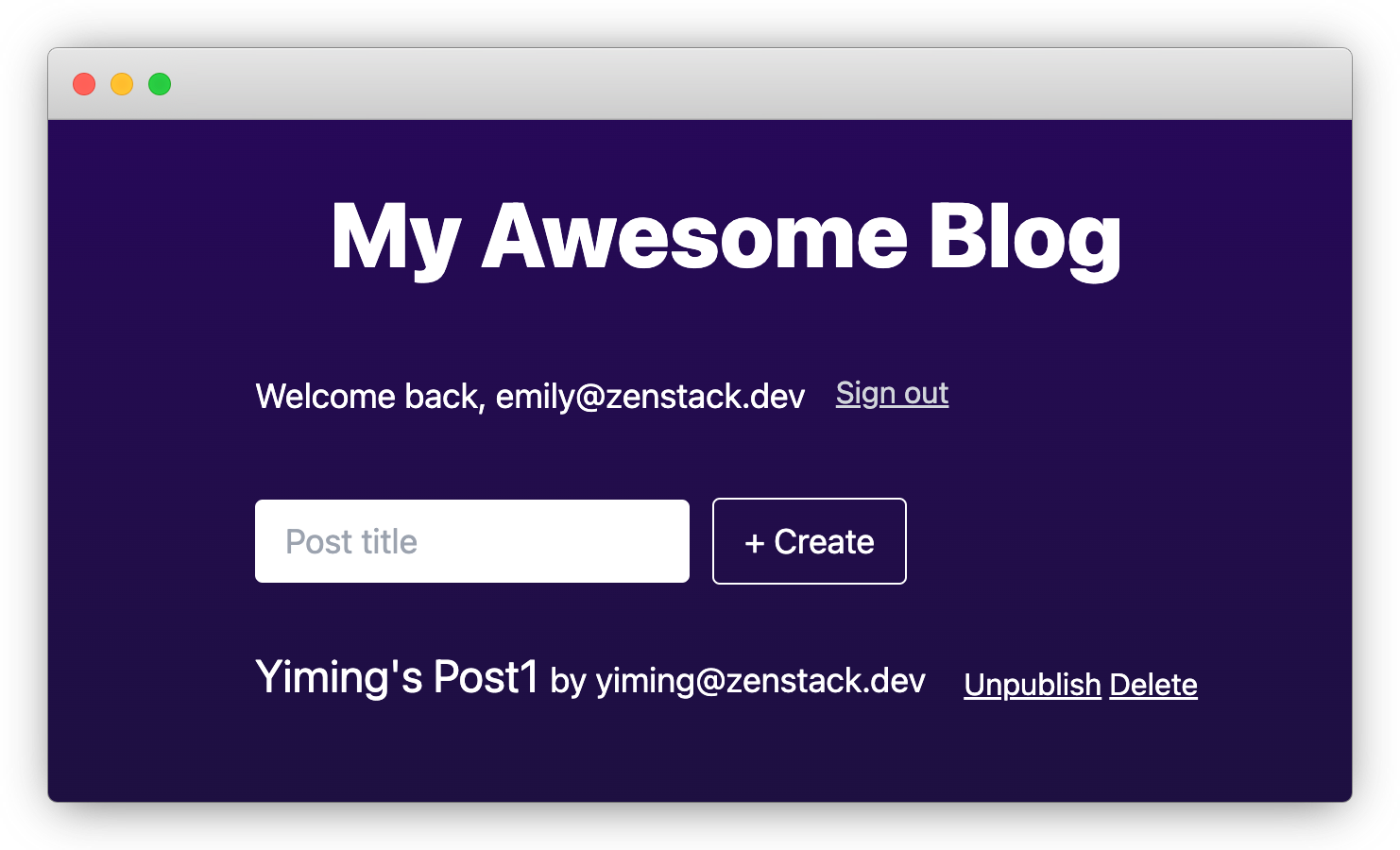 Now, open a new incognito window and sign up a new account emily@zenstack.dev. "Post1" should appear in her list, since our access policy allows all users to read published posts.